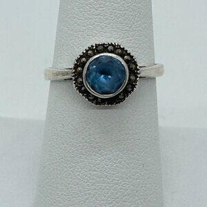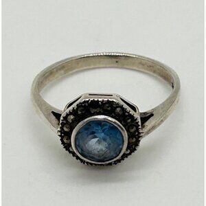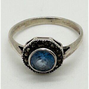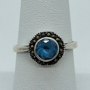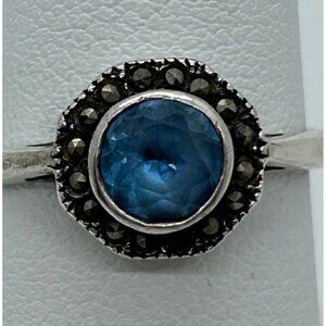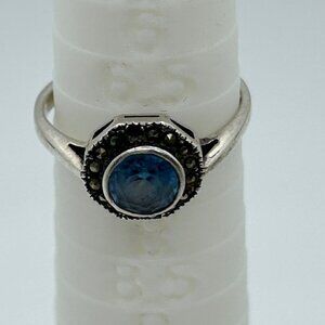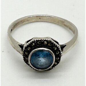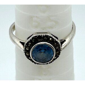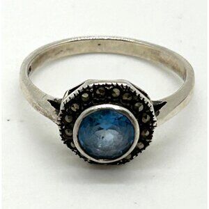 Vintage Sterling Silver Ring Blue Stone Marcasite Art Deco Revival1980s Size 7