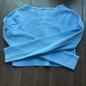 Light blue cropped cardigan originally ordered from YesStyle. In good condition, but has some light fraying around the button holes and a tiny stain on the back of one of the sleeves (see pics). Top is 14 1/4" in length with 23.5" sleeves.