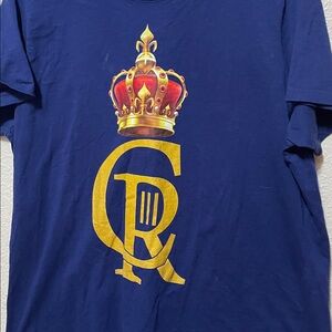 Stylish navy blue t-shirt featuring a bold gold crown design. Perfect for casual wear.