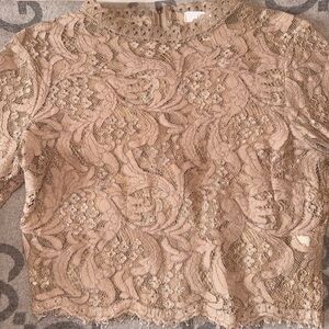 Chic lace blouse with intricate patterns. Features stylish bell sleeves. Ideal for a sophisticated look.