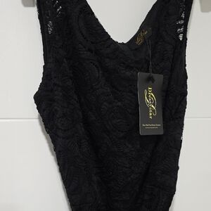 This elegant black lace wedding dress features intricate detailing and a flattering silhouette. Perfect for making a statement on your special day.