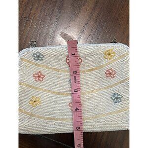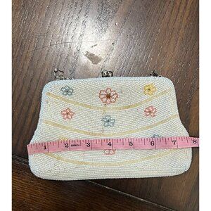 Cream ivory, off white handmade beaded mini purse. Pink, blue, yellow small flower beads embordered. Made in Japan.