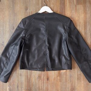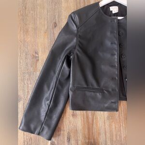 Chic black leather jacket with button details. Stylish and versatile for any wardrobe.