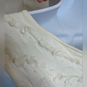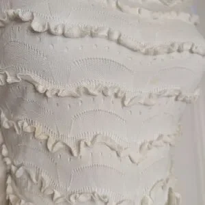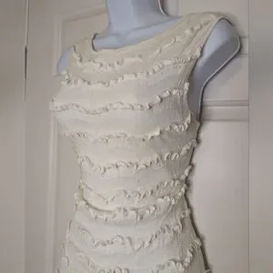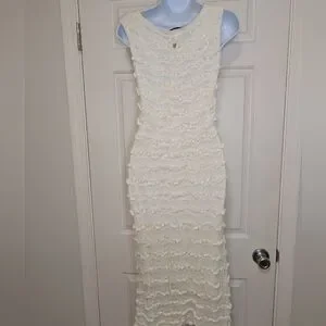 Chic cream long ruffled knit dress with soft lining slip! has small logo on back! Ideal for elegant occasions. Timeless and stylish design. sexy body contouring dress