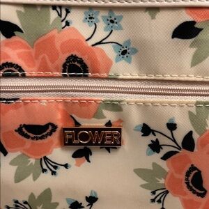 Elegant floral cosmetic bag in cream and orange, perfect for organizing your essentials with style. Includes clear travel bottle