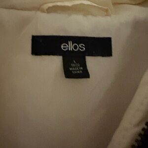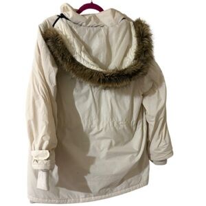 Stylish cream jacket with fur hood. Features button and zipper closure. Perfect for cool weather. Size large. In good used condition. No stains.