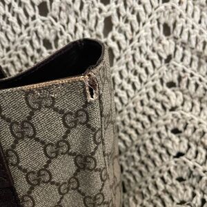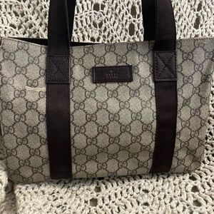 Elevate your style with this elegant Gucci tote bag. Featuring a classic beige and brown design, this bag is perfect for any occasion. The iconic Gucci pattern adds a touch of luxury to your ensemble.