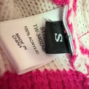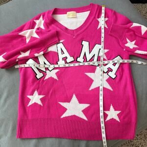 Bold graphic star knit sweater by Judith March in vibrant hot pink with large varsity style block MAMA lettering across the front. Super soft acrylic blend with oversized star pattern and cozy ribbed cuffs and hem. Size small with relaxed roomy fit. V neckline adds classic pullover silhouette. 100 percent acrylic. Approx measurements: pit to pit 23 inches length 25 inches. Perfect for gifting or styling with wide leg jeans boots and a beanie for fall layering.