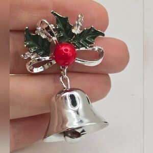 Vintage Christmas Brooch Hanging Jingle Bells And Enameled Holly Pin