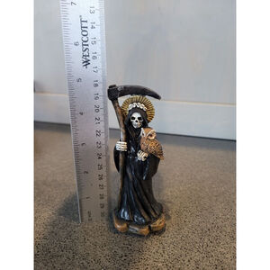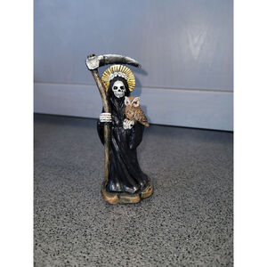 black grim reaper statue, owl reaper figurine, gothic halloween decor, santa muerte owl, world of wonders skull