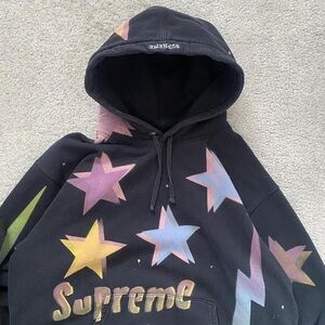 Black hoodie with colorful stars and lightning design. Supreme logo on front.