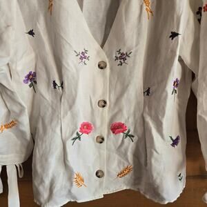 Super cute front and back embroidered blouse. Adjustable tie sleeves with a button front. Back tag was removed for wear and has been dry cleaned since. Looks cute out or tucked into jeans.