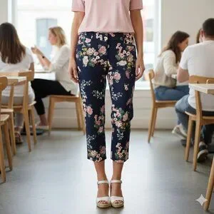 Add a touch of elegance to your seasonal wardrobe with these stunning New York & Company Navy Floral Capri Pants. These pants feature a sophisticated floral pattern that makes them a standout choice for both professional settings and social gatherings.
