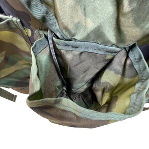 Durable camouflage backpack with multiple compartments, adjustable straps, and nylon construction for rugged outdoor or tactical use. Includes care instructions integrated in liner.