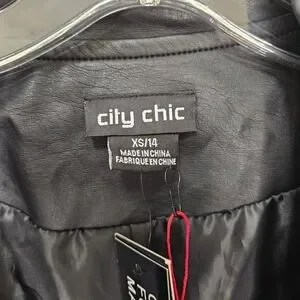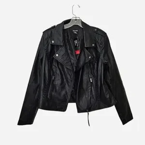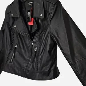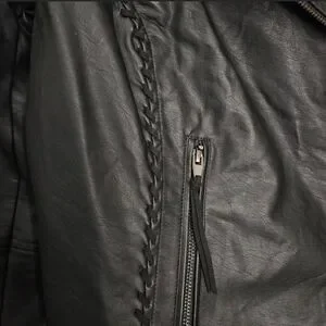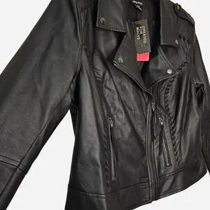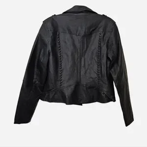 Black faux leather biker Jacket with braided details & zipper pockets womens XS