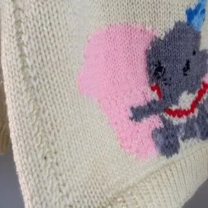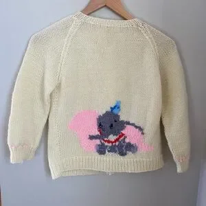 Vintage Disney Dumbo Handmade Handknit Cardigan Sweater Zip-up Intarsia Embroidered Knitwear Cottagecore Kidcore Nostalgic Retro 80s 90s Aesthetic Whimsical Cozy Warm Chunky Boxy Raglan Slouchy Sustainable Slow-fashion Heirloom Unisex Gender-neutral Oversized Layering Winter Fall Spring Boutique Unique Rare Collectible Disneyana Character Nursery Storybook