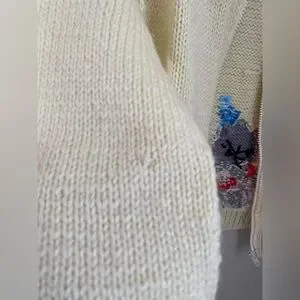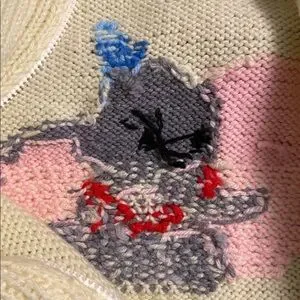 One-of-a-kind, handmade cream knit cardigan featuring a sweet Dumbo character on the back. This charming piece features a full zip front, a pink button closure at the neck, and delicate pink embroidery at the cuffs. Perfect for Disney lovers or as a cozy, nostalgic layer.