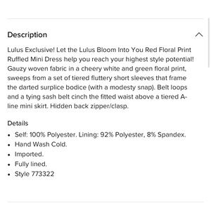 Gauzy woven fabric in a cheery red pink and green floral print, sweeps from a set of tiered fluttery short sleeves that frame the darted surplice bodice (with a modesty snap). Belt loops and a tying sash belt cinch the fitted waist above a tiered A-line mini skirt. Hidden back zipper/clasp.