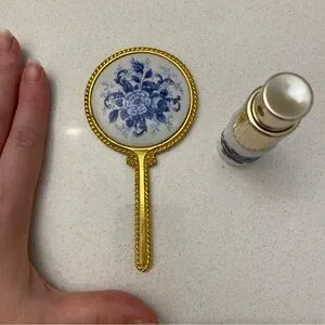 Vintage handheld gold and porcelain floral handheld mirror and atomizer set. Good condition but some speckling/imperfections on the mirror as seen in the second photo. Mirror measures approximately 5" and the bottle measures approximately 3"