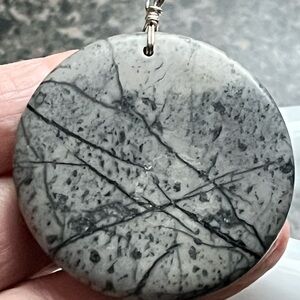 Hand-wrapped in sterling silver, this striking 44mm Picasso Jasper medallion features bold, natural linework — a wearable canvas of smoke, stone, and stillness.