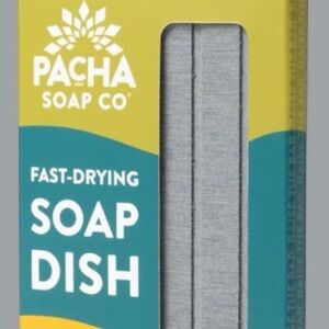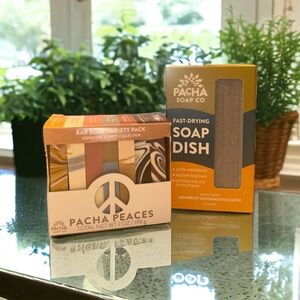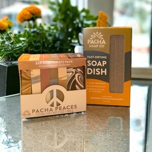 New with tags, unused Pacha Soap Co giftable set featuring the Pacha Peaces Bar Soap Variety Pack paired with a fast-drying soap dish.