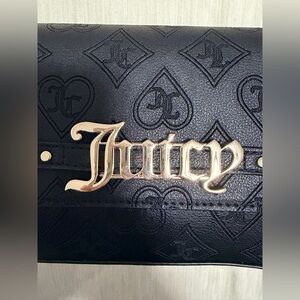 Stylish black shoulder bag with gold-tone accents. Features Juicy Couture logo. Elegant and versatile design.