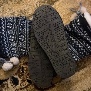 Bearpaw boots with a cozy pattern. Features pom-pom accents.