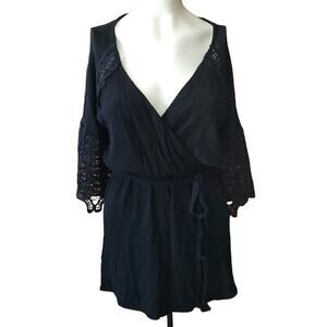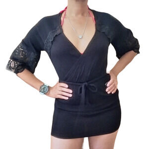 ISABELLA ROSE gauzy lace sleeve black boho beach cover up mini dress Size S NEW