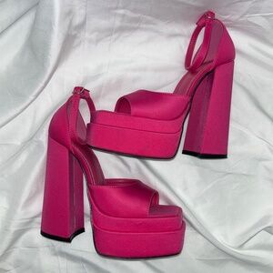 Public Desire hot pink double platform high-heel sandals with a block heel and an ankle strap.