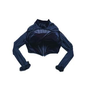 • Features: Velvet bodice, sheer mesh sleeves, feather cuffs, cropped silhouette