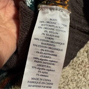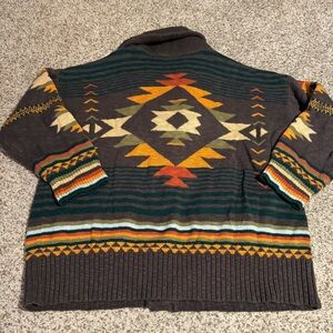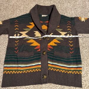 Cozy cardigan with vibrant geometric patterns. Features button closure and shawl collar. Ideal for layering. Very good condition. Product info: A rich heritage pattern in autumnal hues stands out on this cozy organic-cotton cardigan fashioned with a shawl collar.