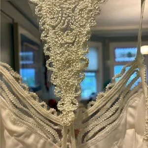 • Intricate Detailing: Features a beautifully embroidered lace bodice and elegant crochet open back design, perfectly showcasing the intricate lacework and subtle skin.