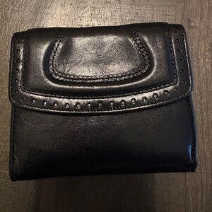 Snap-closure design with multiple card slots, clear ID window, and a divided bill compartment.
