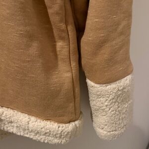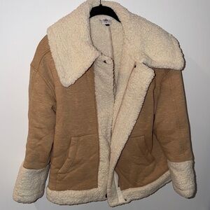 Cozy teddy jacket with soft cream lining. Stylish tan exterior. Ideal for chilly weather.