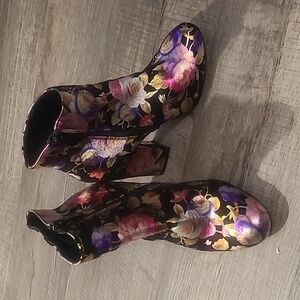 EUC Bamboo Namaste Floral Black Block Heel Ankle Boots Women's Sz 6.5