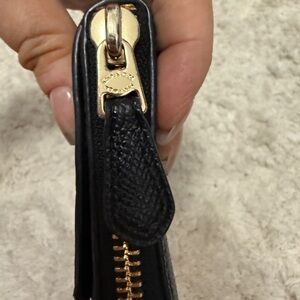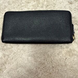 Sleek Coach wallet in black with gold logo. Textured finish adds sophistication.