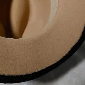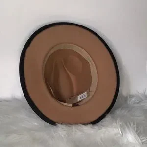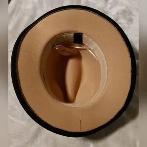 Elevate your style with this chic tan and black fedora. Featuring a striking gold chain accent, this accessory adds a touch of elegance to any outfit.