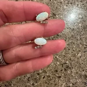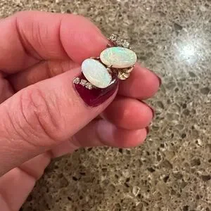 These stunning gold earrings feature beautiful opal stones, perfect for adding a touch of elegance to any outfit. Gold acid testing was a strong confirmation of 14k and a weak finding of possible 18k. I do not know if the diamonds are real.