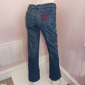 Rare HARLEY-DAVIDSON Embroidered Straight Boot Leg Slight Stretch Denim Jeans Sz 12 EUC. Measurements approx: Waist across 16.5"/ inseam 30.5"/ rise 9"/ hips across 19.5"/ mid thigh across 10"/ hem across 9". Freshly washed no flaws except small area on back pocket see pic. Embroidered logo back pocket. Floral/ eagle embroidery left front pocket and right thigh. Denim sturdy and softened with wear, still with good form and feel. Slightly elasticized waist and 98% cotton & 2% spandex denim for comfort and fit. Unique hardworking Harley Davidson!