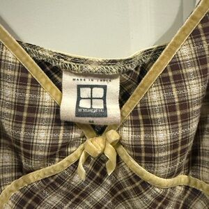 Stylish maxi dress with a plaid pattern. Features brown and yellow colors. Perfect for casual outings.