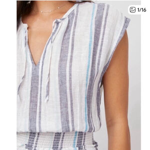 'Easy, relaxed, great for travel and the weekends-that's the Ashlyn Dress. The midi dress has blue-colored stripes, a smocked waist, flowy skirt, and a ruffle tier at hem. It's cut from an airy, luxe linen that'll take you from spring to summer.' Above from Rails website