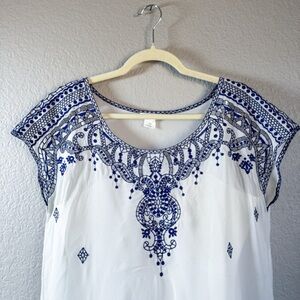 Beautiful Club Monaco shift dress in a soft cream silk with intricate blue embroidery throughout. Easy, pull-on silhouette with a relaxed drape that works dressed up or down. This is one of those pieces that feels elevated without trying too hard, polished but still effortless.