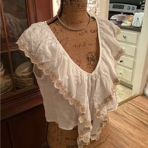 Elegant white top, cotton blend lawn, beige embroidery, Vneck with cascading ruffle, new with tag $138, bust 40” and 19” long.