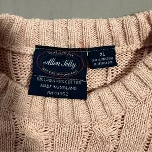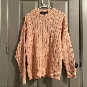 Soft and comfortable crewneck sweater. Features a classic cable knit design. Ideal for casual wear. Light peach coral in color, linen and cotton. Great sweater perfect for anyone. The pit to pit measurement is 21 inches laying flat, has some stretch, would fit also fit Large