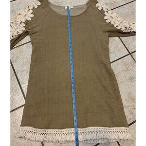 This UMGEE dress is a perfect addition to your wardrobe. The dress features a beautiful floral pattern and is made of a lightweight, woven fabric. The dolman sleeves and round neckline add a touch of elegance to the dress, while the fringe and crochet accents give it a bohemian feel. The dress is perfect for casual occasions and can be worn in the fall and spring seasons. It comes in a size S and is brown in color. The dress is easy to care for, as it is hand wash only. Get ready to rock this stylish shift dress, perfect for any bohemian or flower-themed event!