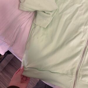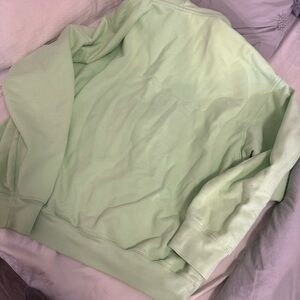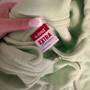 Soft light green hoodie with zip closure. Features a cozy hood and extra fleece lining.