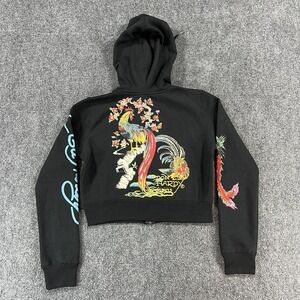 Ed Hardy Hoodie Womens Medium Black Cropped Floral Phoenix Tattoo Full Zip