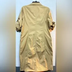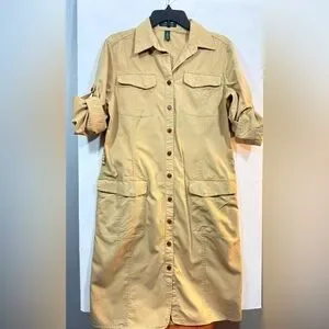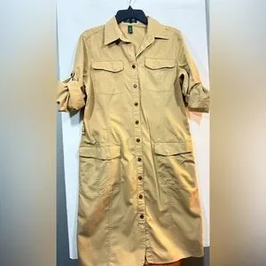 Stay stylish and comfortable with this versatile tan utility dress. Perfect for layering, it features multiple pockets and a classic design.
