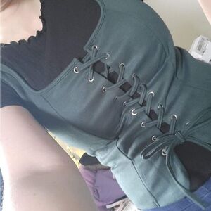 This stylish green corset top features a chic lace-up front, perfect for adding a touch of elegance to any outfit. Ideal for both casual and formal occasions.
