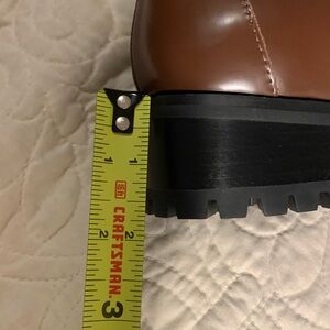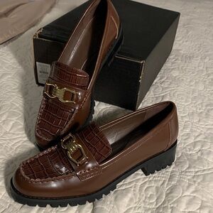 Chic brown lug sole loafers with croc-embossed design. Gold buckle detail adds elegance. Genuine leather. Perfect condition. Never worn. Size 8.5